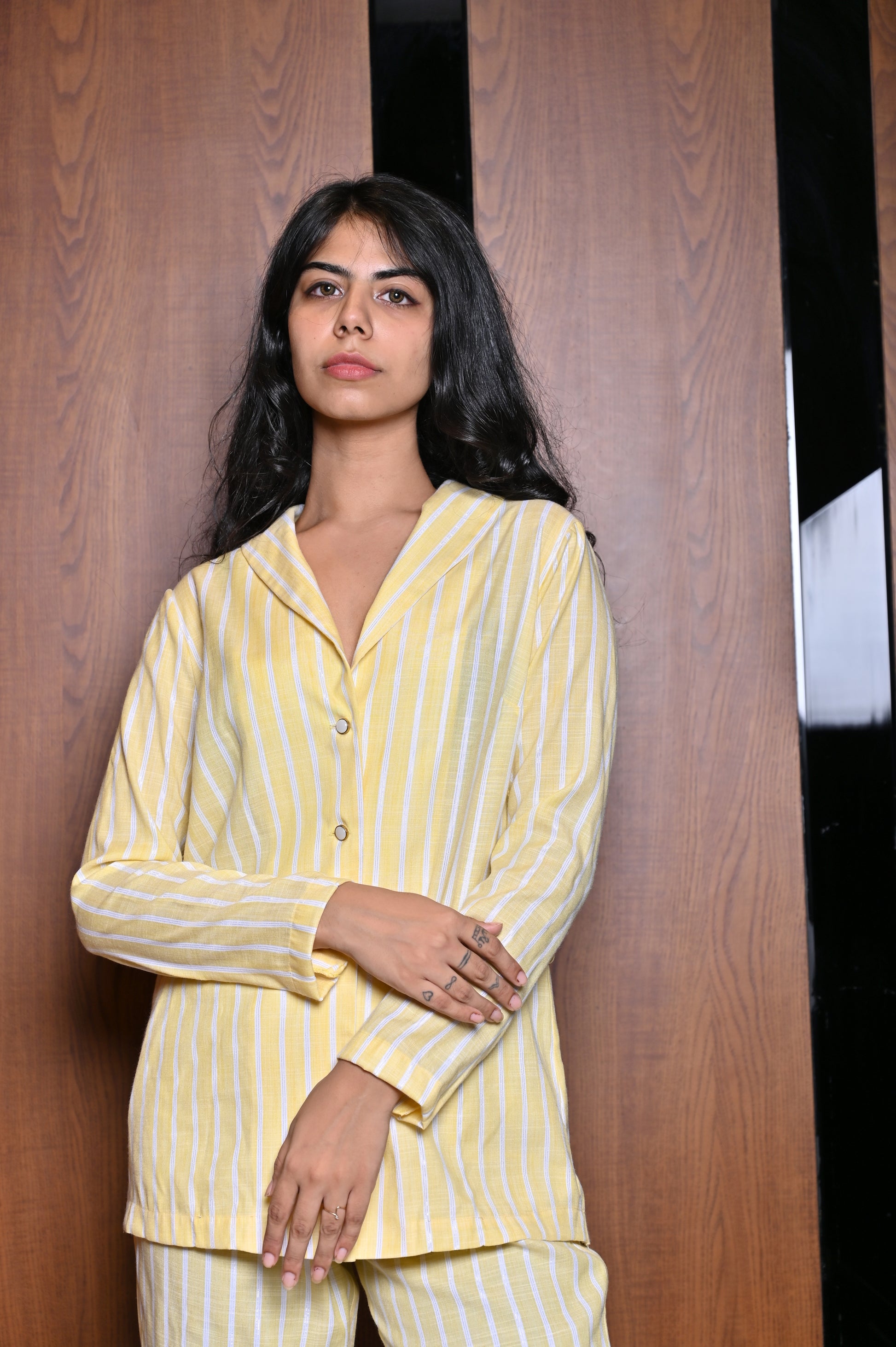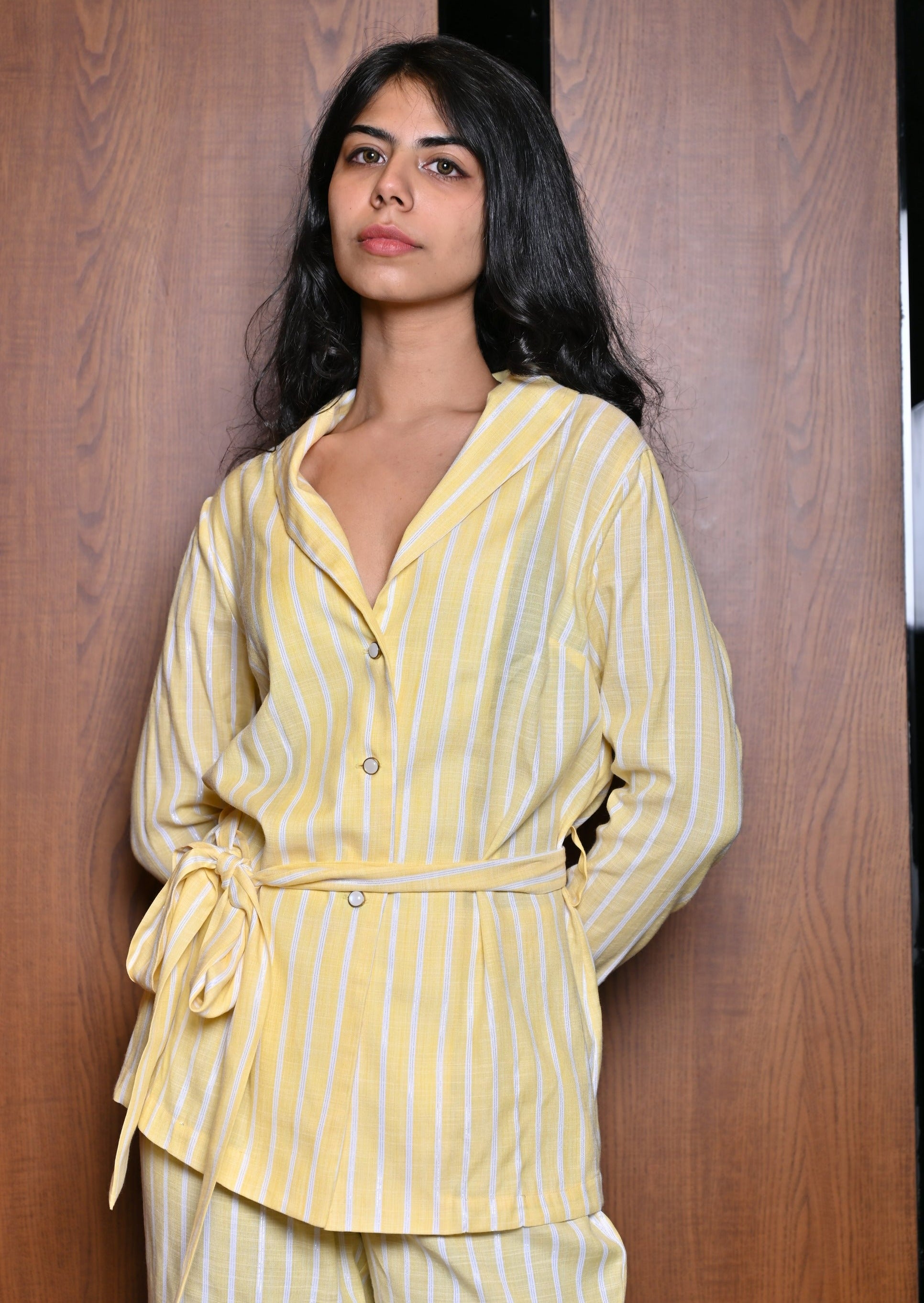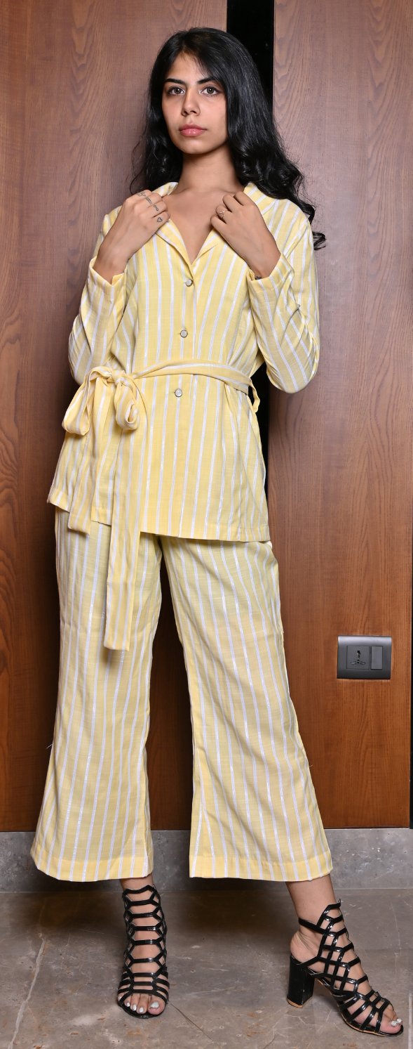 Yellow Blazer Style Co-ord Set comes with long blazer style shirt with fabric belt and loose fit pants.